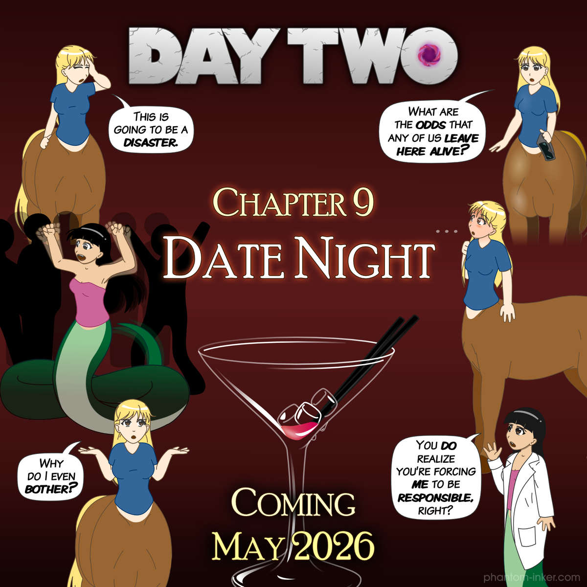 Coming this summer, it's time for Day Two Chapter 9, "Date Night!" In which... nothing important happens, as usual 😉