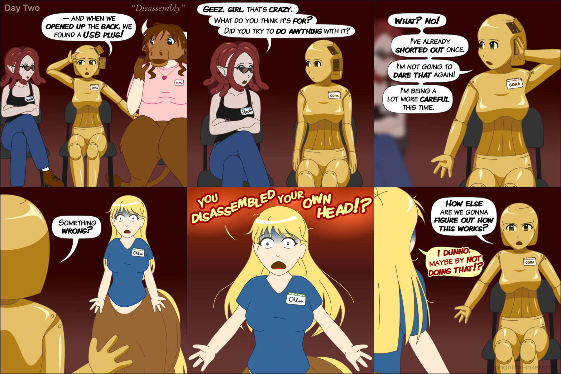 - Cora (pointing at her head, with two panels open): "And when we opened up the back, we — found a USB plug!"