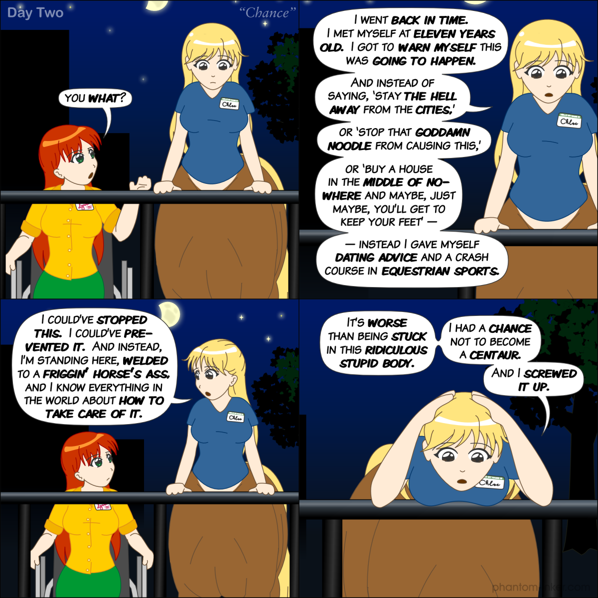 - Chloe (leans over the railing, hands on her head): "It's worse than being stuck in this ridiculous stupid body." "I had a chance not to become a centaur." "And I screwed it up."