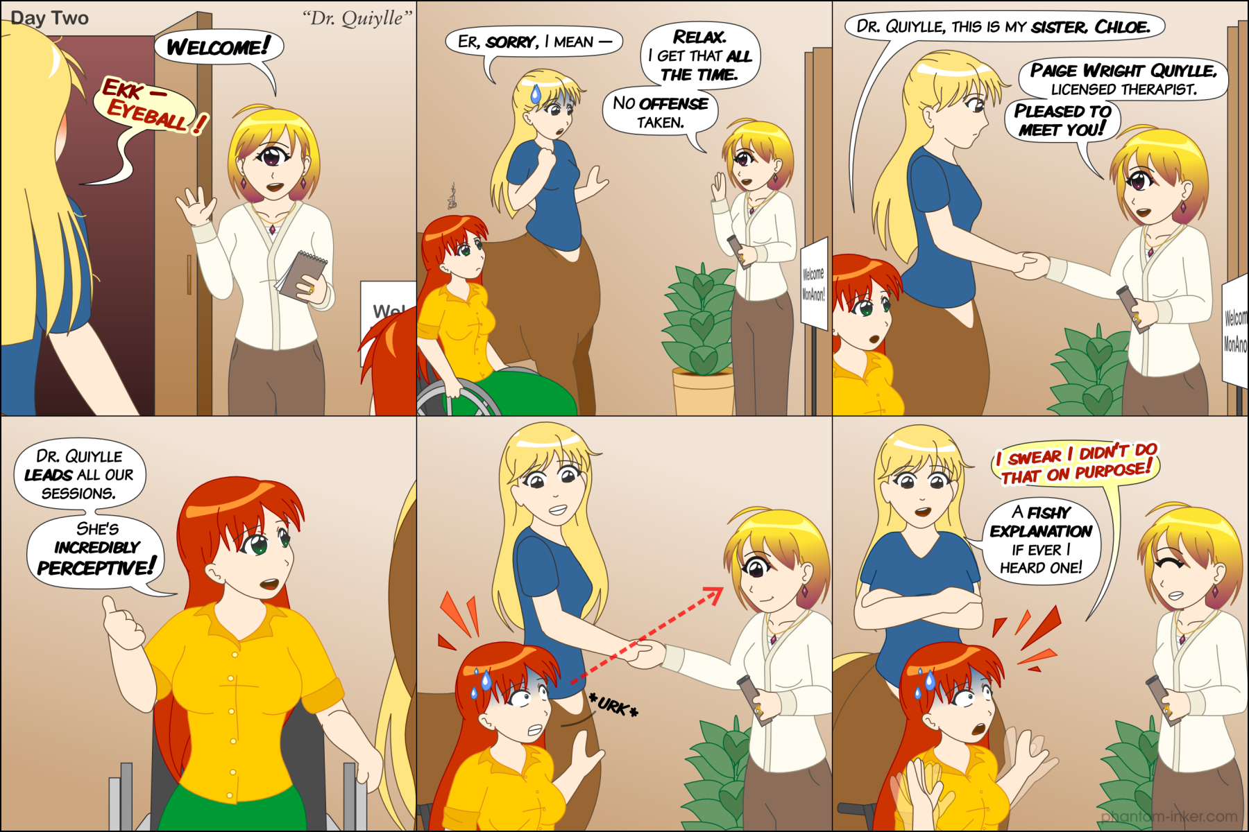 - Lynne: "Dr. Quiylle, this is my sister, Chloe." Quiylle: "Paige Wright Quiylle, licensed therapist." "Pleased to meet you." *Chloe and Dr. Quiylle shake hands.* Sign: "Welcome MonAnon!"