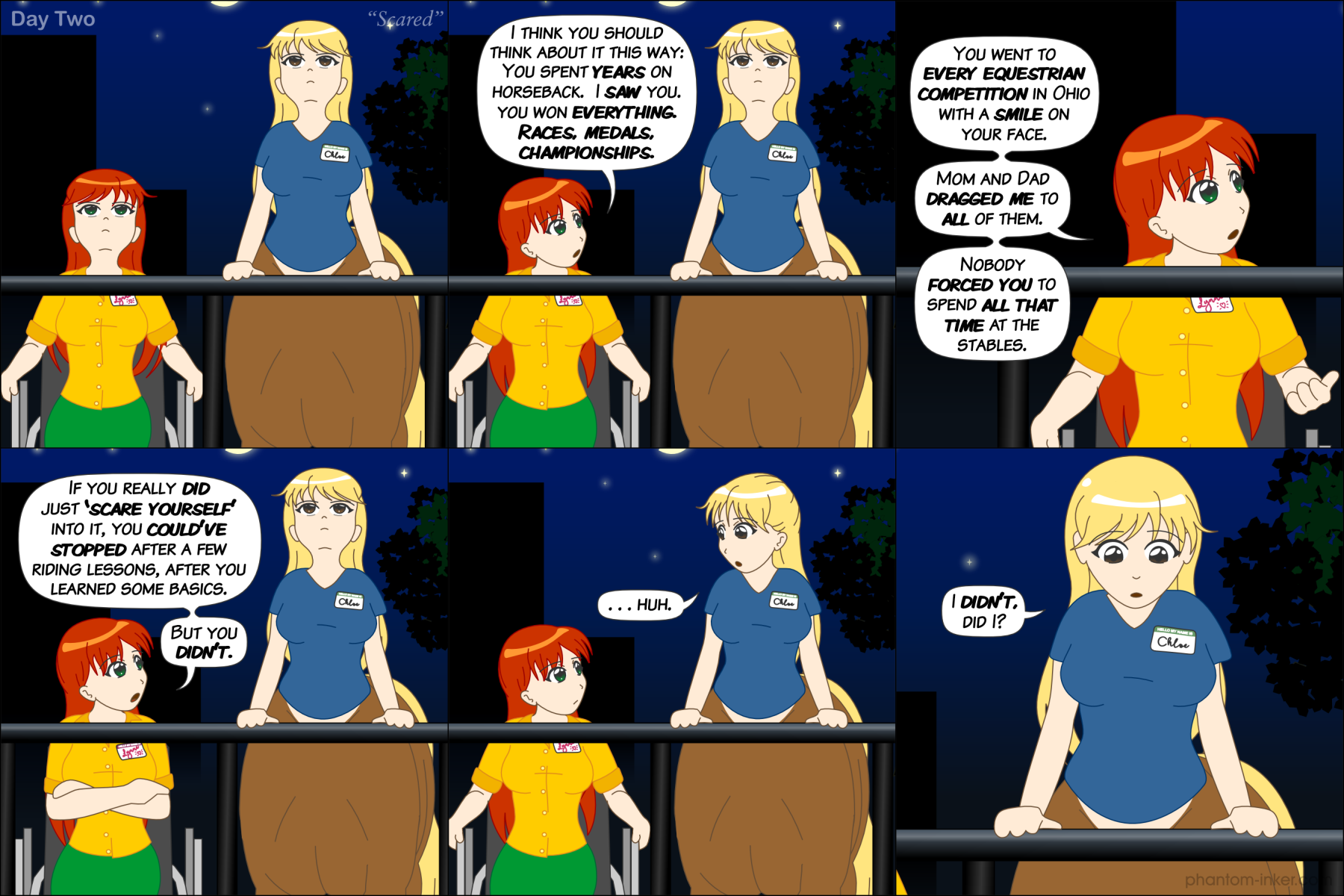 Lynne: "If you really did just 'scare yourself' into it, you could've stopped after a few riding lessons, after you learned some basics." "But you didn't."