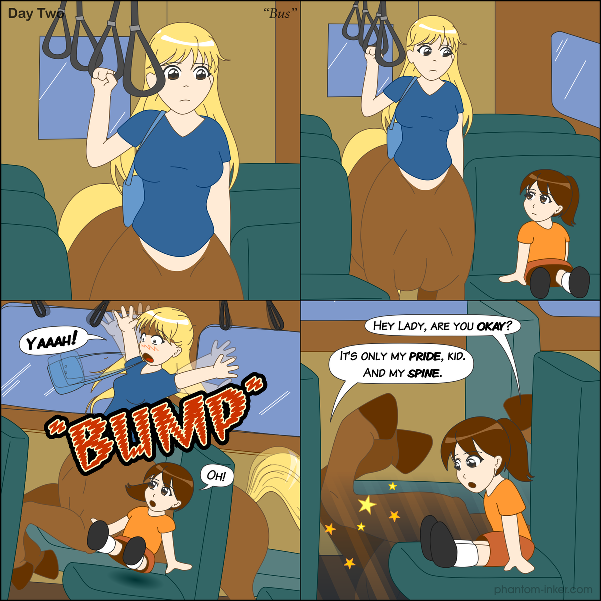 - Chloe, on the bus, standing in the aisle, holding onto an overhead strap.
